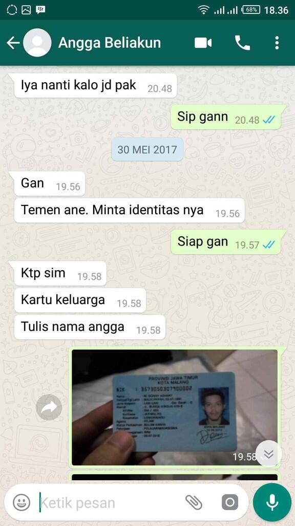Perkenalkan nama ane mohammad donny adhari, Kronologi awal saya berniat menjual akun Line@ di forum jual beli kaskus, setelah ane posting, ada yang berniat membeli, dan dia(penipu) melakukan chat di WA, dia (penipu)berniat membeli akun ane. dia nanya2 ane lokasi di mana, dan dia gak bisa cod karena lokasinya sama ane jauh, lah dia menawarkan rekber, yang kliatannya rekbernya gak meyakinkan, setelah itu beberapa hari lagi dia bilang temennya berminat, dia mau transfer tapi ada syarat harus memberikan identitas, alias fotoin lewat identitas, karena harga akunnya gak murah sekitar 7 jutaan, suruh kirim ktp, sim, kk, sama foto ane bawa semua itu. iya emang bodohnya ane, ane lagi butuh duit banget, dan ane minta juga identitasnya temennya ( ternyata hasil menipu foto ktp sim seperti cara dia lakukan terhadap ane) setelah udah sama2 ngasi identitas, katanya mau transfer ternyata, orang yg ditunggu2 belum transfer, dan gak ada kejelasan wa nya gak bisa dihubungi. ane langsung ya udah muggkin belum rezeki ane. eh selang beberapa bulan ada yang laporan dan hubungi lewat fb, kalau saya menipu dll, Astaghfirullah ane gak pernah menipu gitu, dan dituduh menipu, katanya beli akun coc, trus beberapa bulan berikutnya mobile legend, dan yang paling banyak dia tipu akun akun mobile legend. ane aja jujur gak pernah main mobile legends sama coc. berikut chatnya gan