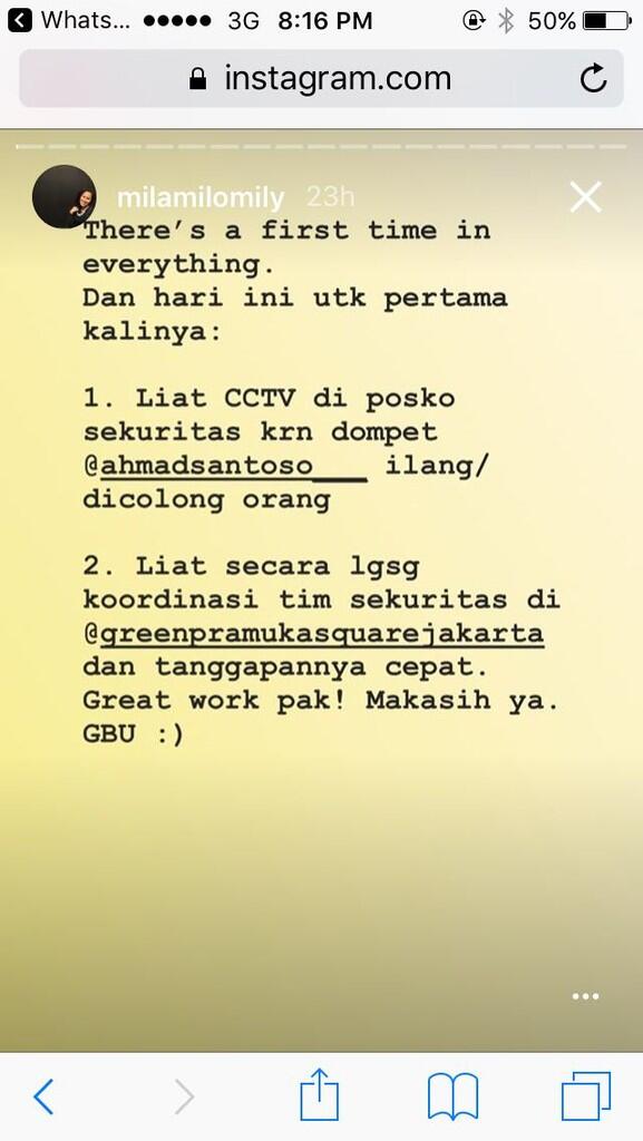 [ltr]Menurut Mila, dia menyaksikan secara koordinasi tim keamanan Green Pramuka Square yang merespons cepat laporan kehilangan dompet rekannya Ahmad Santoso. "Liat secara lgsg koordinasi tim sekuritas di @greenpramukasquarejakarta dan tanggapannya cepat. Great work pak! Makasih ya. GBU :)" tulisnya di Insta Story.[/ltr]