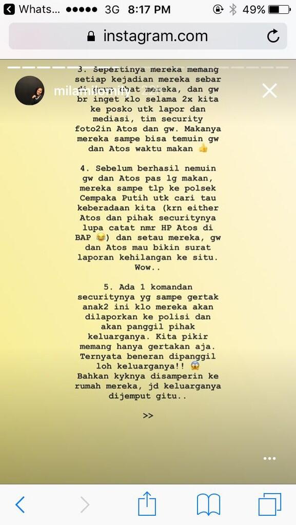 [ltr]Yang membuat Mila dan Atos berdecak kagum adalah respons cepat pihak sekuriti yang memfasiltiasinya. Termasuk membantu melaporkan ke pihak Polsek Cempaka Putih. Tak hanya itu, pihak sekuriti Green Pramuka Square juga memanggil keluarga kedua anak tersebut agar diberikan bimbingan. "Bahkan kayaknya disamperin ke rumah mereka, jadi keluarganya dijemput gitu" tambah Mila.[/ltr]