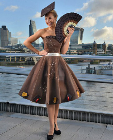 Gaun coklat ini diperagakan oleh model cantik asal Jerman, Alena Gerber yang tak kalah menggoda. Sebab benar-benar terbuat dari coklat asli.