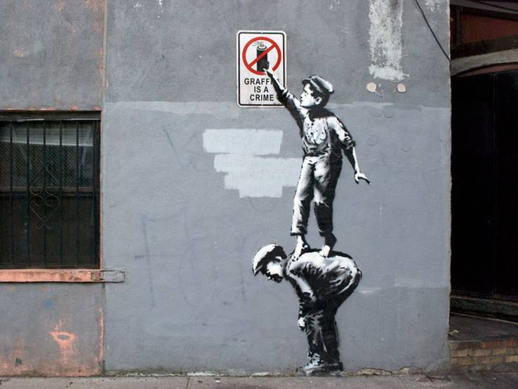 Pada dasarnya yang kita tahu bahwa grafiti adalah karya indah yang terdapat ditembok. Namun grafiti sebenarnya dianggap ilegal dibeberapa kota. Pada tahun 70-an Di Amerika dan Eropa, grafiti dianggap memprovokasi perang antar kelompok atau geng. Karya ini didesain oleh Bansky yang membuat desain grafiti ini untuk bersenang-senang.
