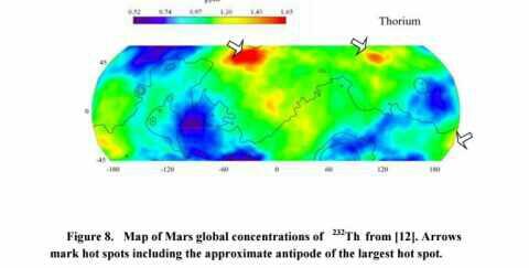 Konsentrasi zat thorium terbesar di Mars ditandai dengan zona merah.