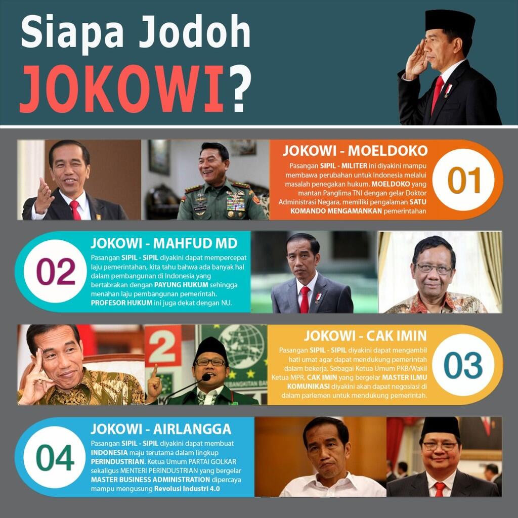 Nama Jokowi sebagai capres pada perhelatan Pilpres 2019 memang masih menjadi kandidat yang paling kuat saat ini. Hal tersebut pun dibuktikan lewat berbagai macam survei, dengan tingkat elektabilitas hampir 50 persen. Sebagai petahana, Jokowi juga telah mendapatkan tiket untuk kembali maju sebagai capres. Namun masih ada satu lagi pekerjaan rumah yang belum rampung, yaitu mencari siapa pasangan ideal Jokowi?