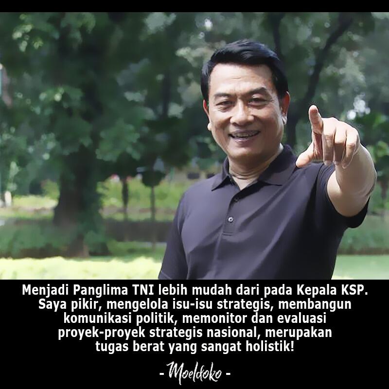 "Saya pikir lebih gampang menjadi Panglima TNI ya. Bukan apa-apa, karena Panglima TNI tidak memiliki tugas yang se-holistik ini. Menghadapi pertanyaan wartawan yang sangat teknis walaupun ada tugas menteri yang menangani. Tapi ini kenapa pada larinya ke KSP sih? Ya walaupun mungkin karena saya sendiri tidak pelit memberikan informasi kepada teman-teman media, sehingga akhirnya KSP menjadi sumber rujukan haha," jawab Moeldoko.