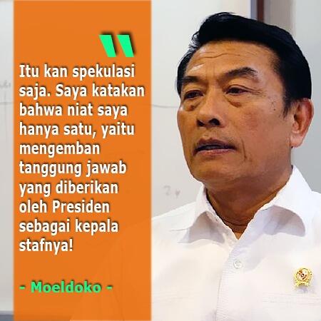 "Itu spekulasi saja, seolah-olah saya mundur karena memiliki niat lain. Saya katakan bahwa niat saya hanya satu, yaitu mengemban tanggung jawab yang diberikan oleh Presiden sebagai kepala stafnya, hanya itu yang saya pegang. Jangan ada spekulasi-spekulasi lain kecuali spekulasi bahwa saya ingin bekerja dengan lebih bagus lagi," kata Moeldoko saat ditemui di Hotel Borobudur, Jakarta, Kamis (5/7), seperti yang dilansir oleh situs berita merdeka.com