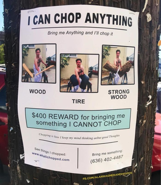 Poster dari seorang ahli potong barang-barang keras. Dalam poster itu pun dengan jumawanya si pemilik poster mengatakan bisa memotong semua hal, baik itu papan kayu, ban karet, hingga sebongkah kayu glonggongan besar. Wah.. Debus nih kali ya. Dia menangtang siapa aja yang bisa ngasih barang yang nggak bisa dipotong olehnya bisa dapet $400. Mayan juga tuh gan! Coba suruh potong tali silaturahmi pasti gak bisa tuh! Hahaha...