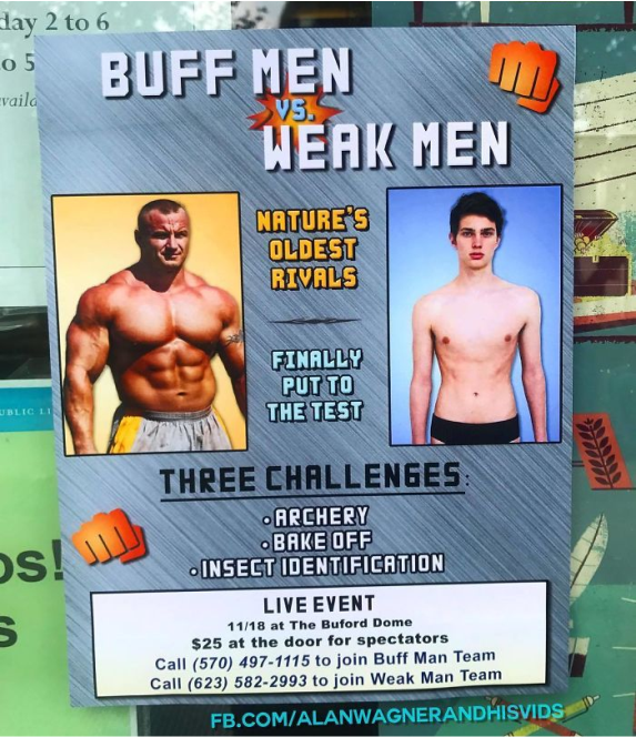 Poster tentang pertandingan seru antara Pria Tangguh vs Pria Lemah. Siapakah yang akan menang?! Tonton langsung pertandingannya dan cabang olahraganya.
