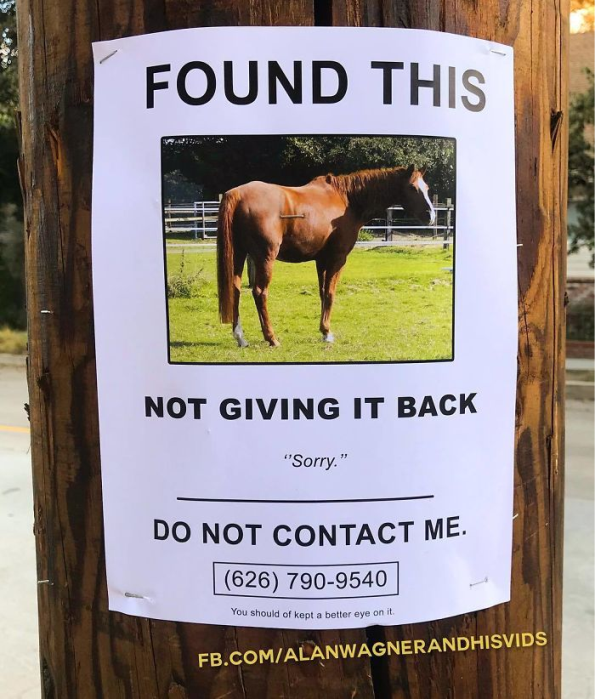 Ditemukan seekor kuda. Namun, bukannya mau balikin kudanya, malah nggak mau dikembaliin karena bagus. Di poster juga tertulis "Maaf" dan "Jangan hubungi aku." Wkwkwkw.. Kocak!