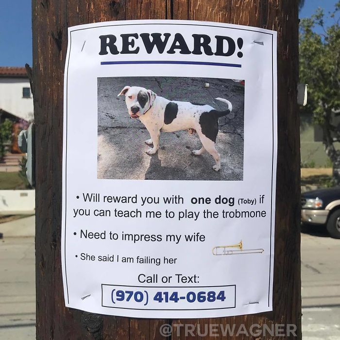 Yok, agan yang bisa ngajarin main terompet bisa langsug hubungin tuh. Karena Pria ini kayaknya butuh banget main terompet biar bisa bikin istrinya terkagum-kagum. Dan hadiah bayarannya lumayan juga tuh, dapet seekor anjing. Tertarik? Hahaha...