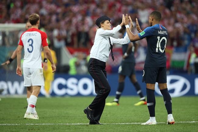 Mereka masuk dan menghampiri beberapa pemain, salah satunya Kylian Mbappe yang malah memberi tos "high five" pada salah satu penyusup perempuan yang menghampirinya.