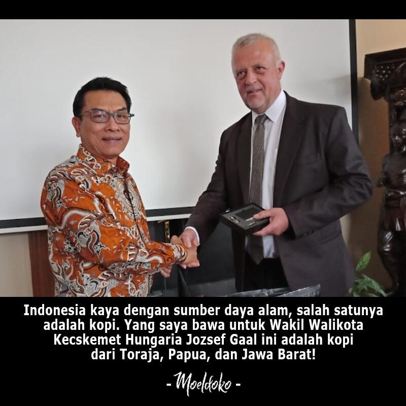 Dalam pertemuan dengan Wakil Walikota Kecskemet Hungaria Jozsef Gaal tersebut Moeldoko membawa kopi yang dikelola oleh anak-anak muda Indonesia yang cinta dengan dunia perkopian. Moeldoko juga bercerita tentang beragam jenis varietas kopi berkualitas tinggi yang mampu di produksi oleh Indonesia dan sudah sangat terkenal di berbagai belahan dunia.