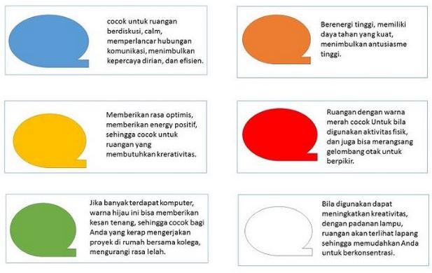 Penggunaan warna dalam sebuah ruangan kerja juga sangat berpengaruh terhadap kratifitas, produktivitas, serta mood. Karena itu meskipun Anda hanya menyukai satu warna tertentu seperti hitam misalnya, berkompromilah sedikit agar ruangan kerja Anda menjadi lebih hidup. Sebagai rekomendasi, warna-warna yang baik untuk digunakan sebagai pembangkit semangat bekerja antara lain: