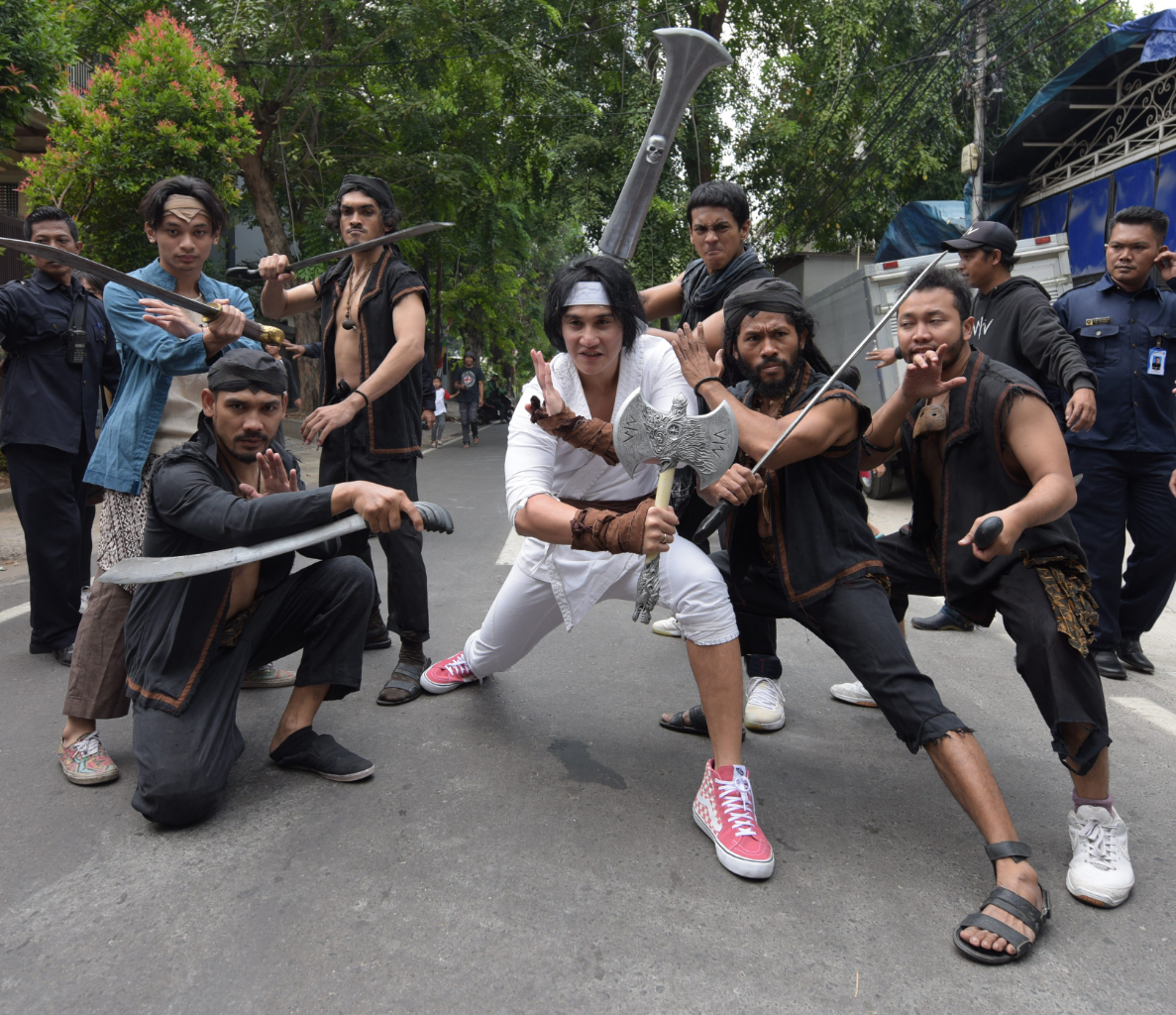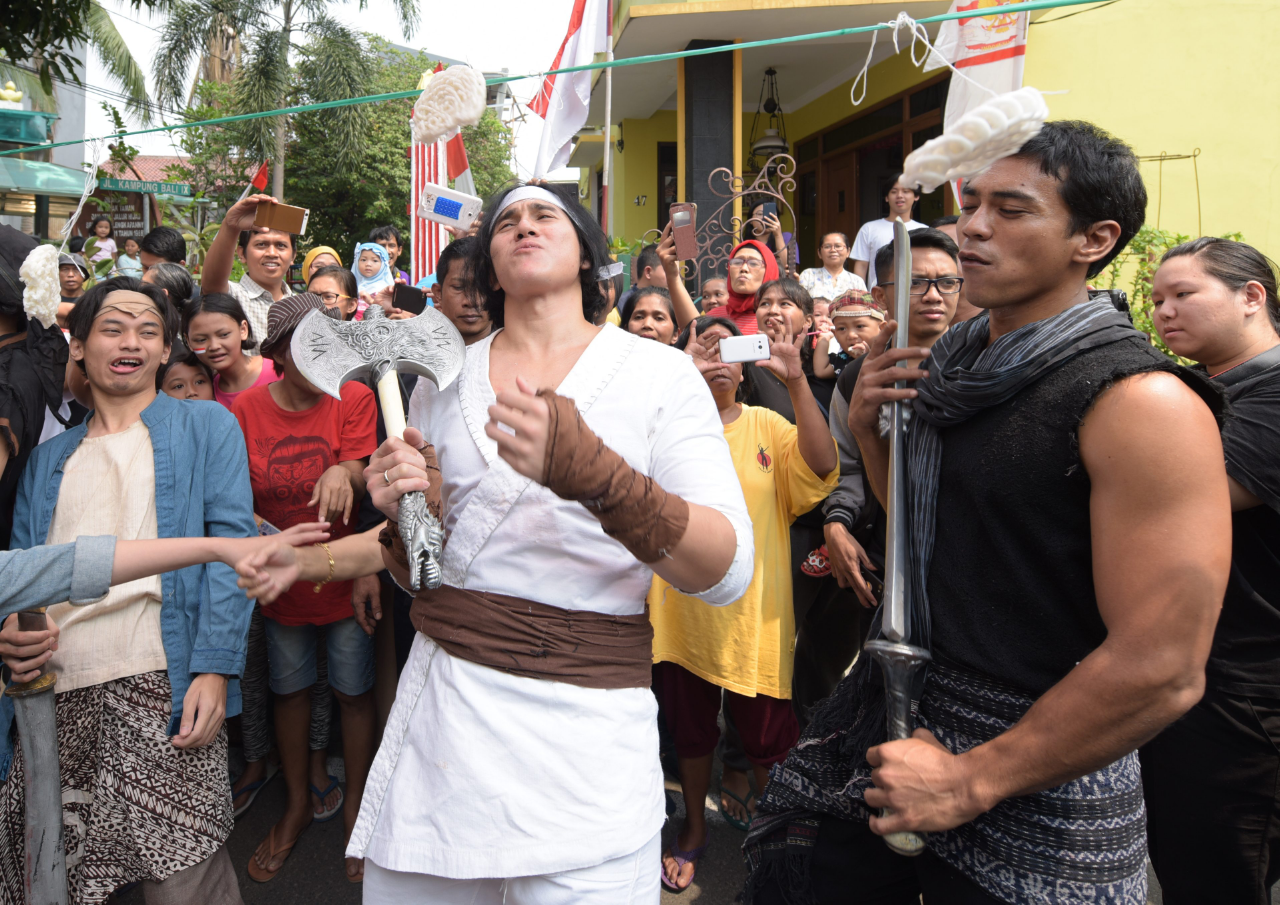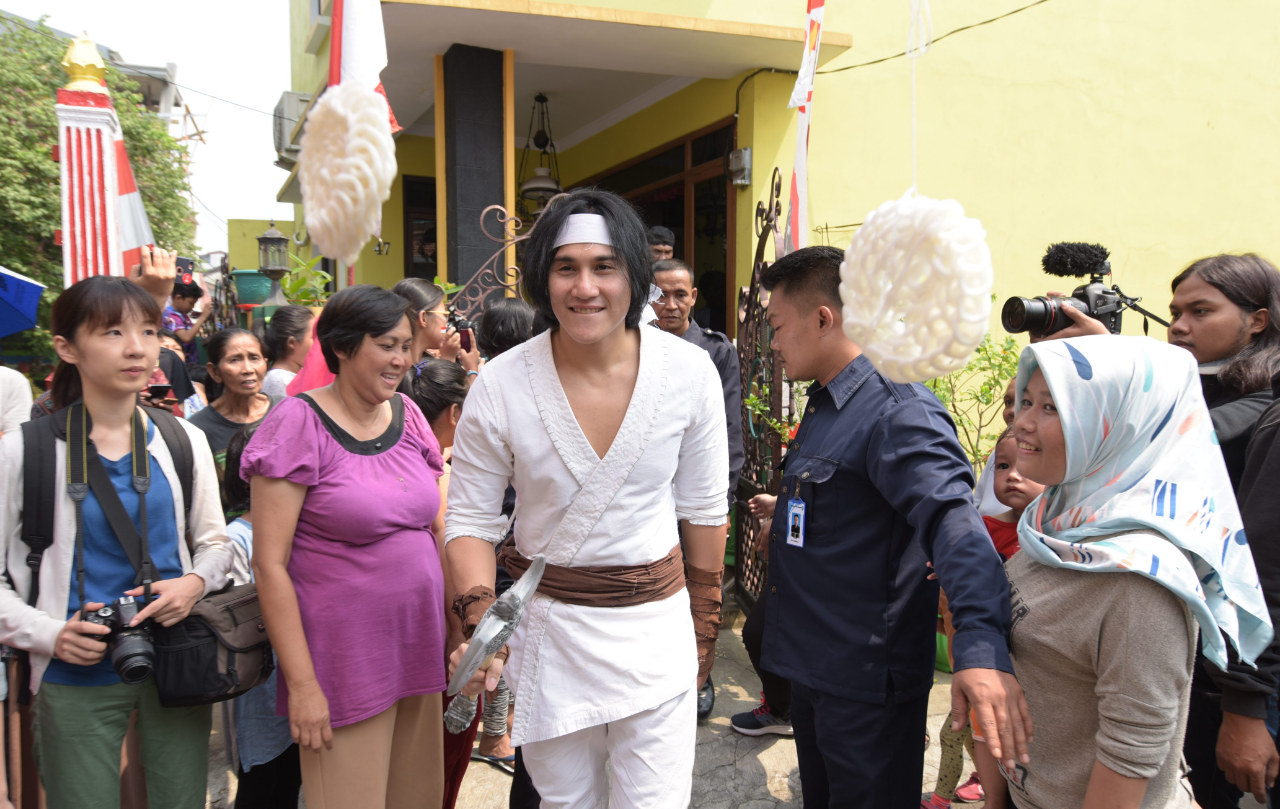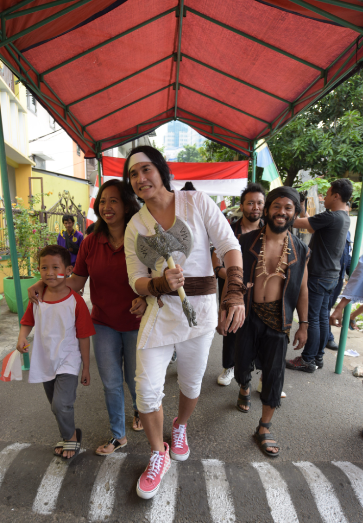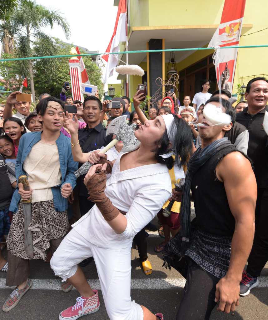 Vino G Bastian, memakai kostum Wiro Sableng lengkap dengan kapak naga geni 212 ikut lomba makan krupuk di Kampung Bali, Jakarta Pusat, jumat (17/8).