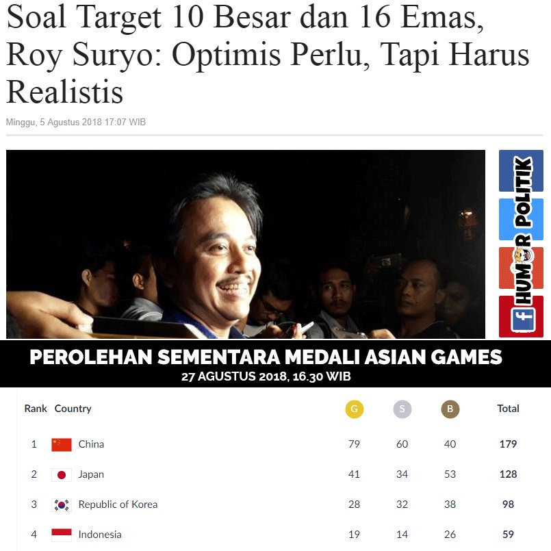 Masih Ingat dengan pernytaan Roy Suryo pada tanggal 5 Agustus 2018 saat dimintai komentar soal target 16 medali emas yang disampaikan oleh Presiden? Bung Roy bilang, optimis boleh tapi harus realistis. Mengingat mepetnya persiapan atlet dan persiapan Indonesia sebagai tuan rumah yang mepet. Terkesan bijak ya? Sekali lagi hanya terkesan bijak, aslinya sih pesimis, mengeluh, tidak yakin pada kemampuan atlet dan pemerintah Indonesia.