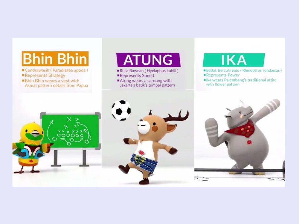 Pada penyelenggaraan Asian Games ke-18 ini terdapat 3 maskot unik asli Indonesia, yaitu Bhin Bin karakter yang diambil dari Burung Cendrawasih asli dari Papua, kemudian Atung yang merupakan Rusa Bawean, dan Ika (Kaka) si Badak Jawa. Maskot-maskot tersebut dipilih karena dianggap melambangkan strategi, kecepatan dan kekuatan. Tak hanya itu, maskot-maskot tersebut juga merupakan binatang endemik yang mewakili wilayah Indonesia bagian Timur, Tengah, dan Barat.