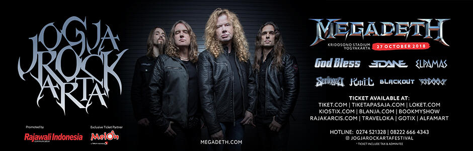 Selain Megadeth, JogjaROCKarta juga akan diramaikan oleh God Bless, Edane, Elpamas, Seringai, Megadeth, Koil, dan Blackout. Dijamin puas head bang! Tiket konser musik ini dibandrol Rp700.000 termasuk terjangkau gan, kapan lagi dapat tiket murah untuk menyaksikan band internasional!