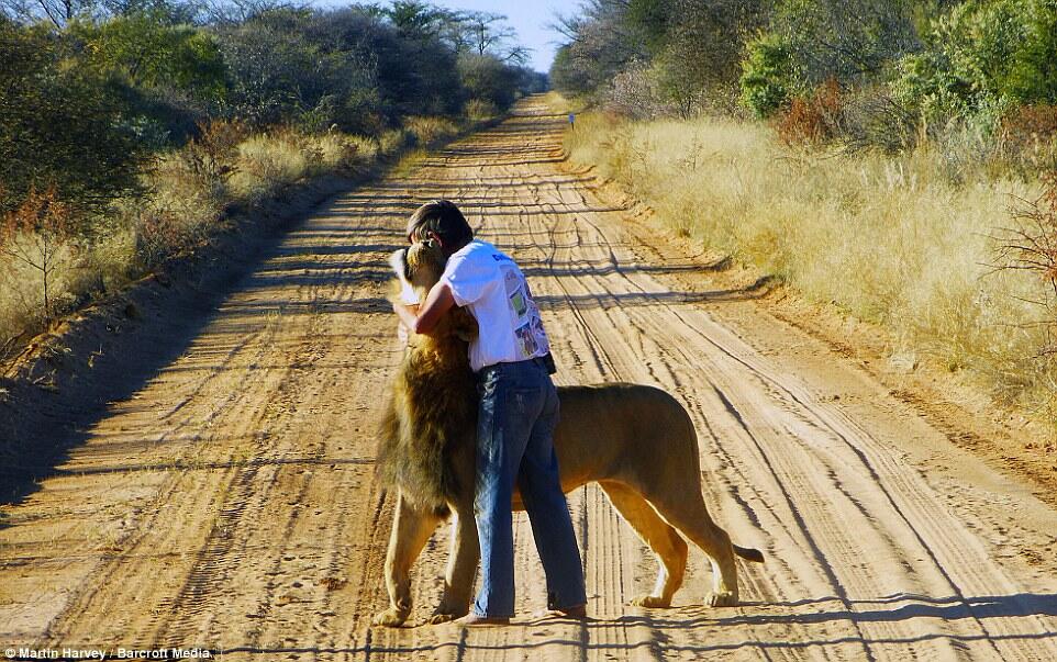 Kevin Richardson , yang sehari-harinya bermain dengan singa putih di sebuah taman di Afrika Selatan. Singa itu tampaknya mencintainya.