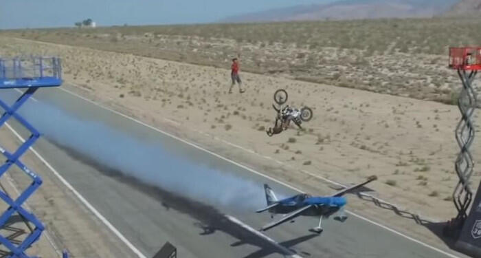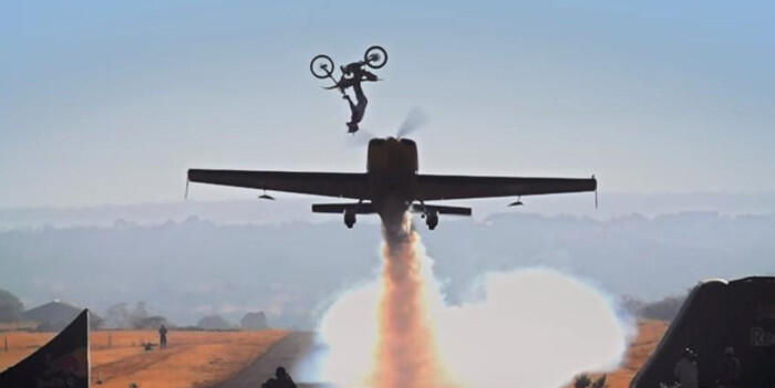Ada kolaborasi motor trail dengan pesawat aerobatik yang ciamik dan telah menyedot banyak perhatian. Adalah biker profesional dalam urusan aksi ekstrem bernama Nick de Wit yang ngelakuin hal tersebut.