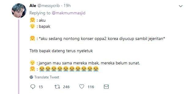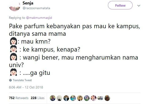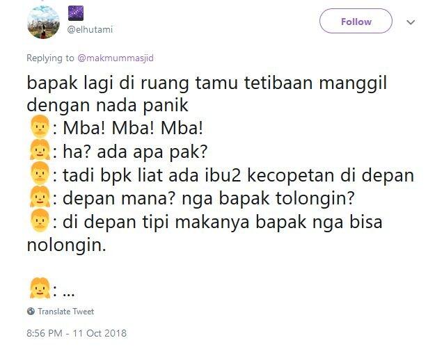 Misalnya saja kini satu keluarga bisa berkomunikasi lewat grup di WhatsApp, Line, BBM, atau platform lainnya. Dan sebagai orangtua, tentu ada saja kelucuan yang mereka ciptakan. Akun Twitter @makmummasjid, mengunggah sebuah thread tentang "dunia bapak ibu" yang sering bikin kita ketawa. Entah itu di chat personal atau grup keluarga. Bahkan ada juga warganet yang membagikan percakapan langsungnya bersama orangtua mereka yang nggak lucu. Dijamin, sebagai anak, kamu pasti pernah merasakan hal-hal ini~