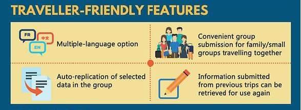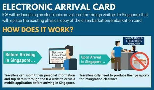 Dengan kartu kedatangan elektronik, kita bisa mengirimkan informasi pribadi dan rincian perjalanan via situs web Immigration and Checkpoints Authority's atau bisa juga via mobile application sebelum tiba diSingapura.