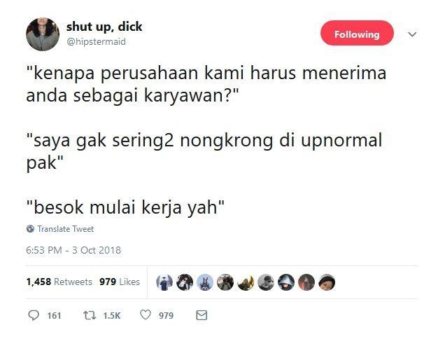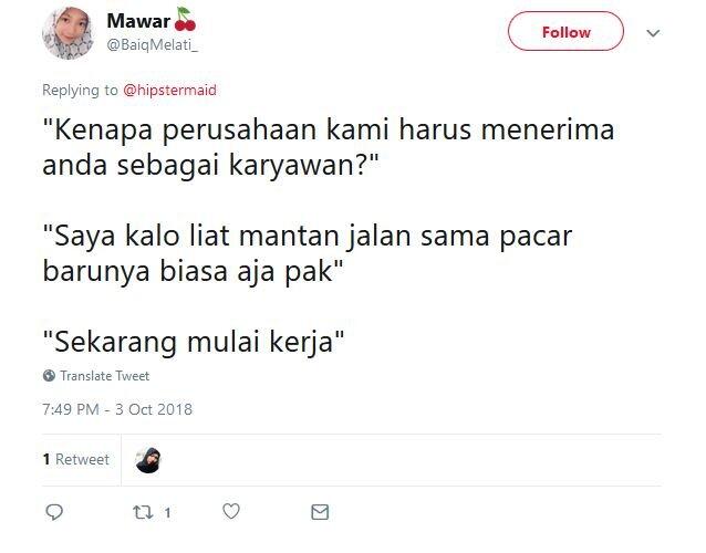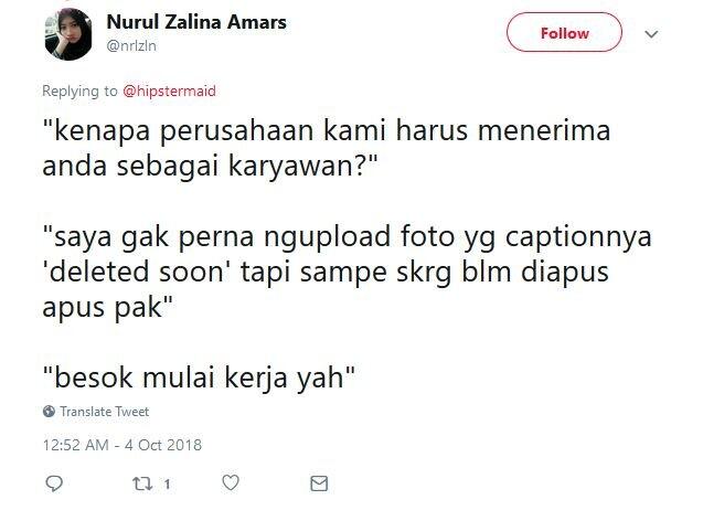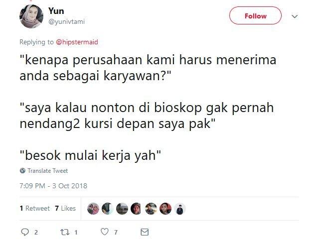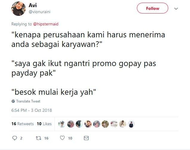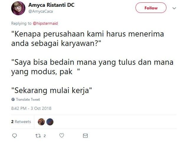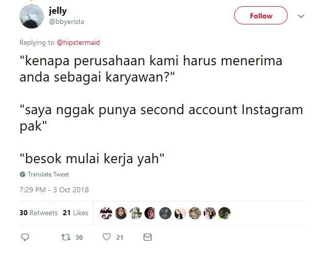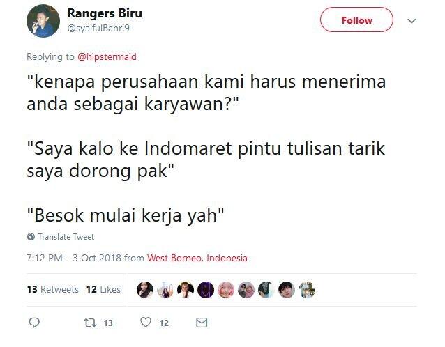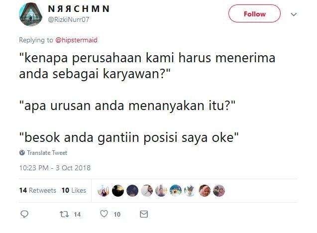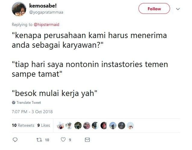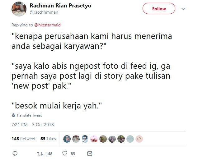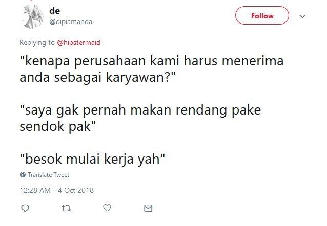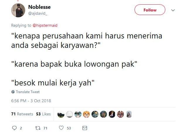Seperti tweet dari @hipstermaid satu ini. Awalnya dia mengunggah percakapan antara HRD sebuah perusahaan dengan calon karyawan yang sedang diwawancara. Ketika ditanya apa alasan perusahaan harus menerima si calon karyawan, jawaban yang dikasih justru bernada guyonan. Kocaknya tweet satu ini akhirnya memicu kreativitas warganet lainnya untuk menuliskan alasan-alasan apa yang bisa membuat seorang karyawan bisa diterima oleh sebuah perusahaan. Kocak deh!