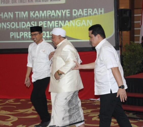 Ketua Tim Kampanye Nasional (TKN) Koalisi Indonesia Kerja Joko Widodo-Ma'ruf Amin, Erick Thohir memapah ulama Kharismatik, K.H. Habib Syarief Muhammad Al-Idrus, menuju tempat duduknya seusai yang bersangkutan memimpin doa.