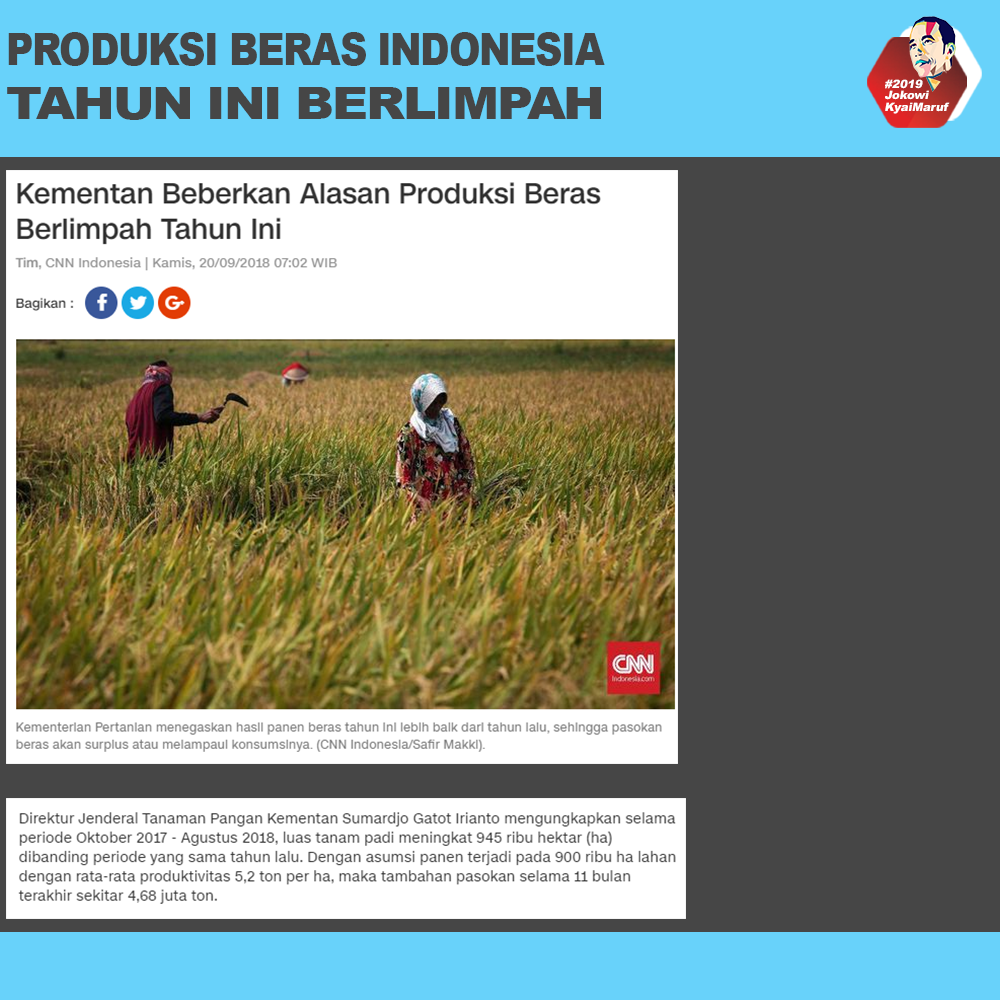 Direktur Jenderal Tanaman Pangan Kementan Sumardjo Gatot Irianto mengungkapkan selama periode Oktober 2017 - Agustus 2018, luas tanam padi meningkat 945 ribu hektar (ha) dibanding periode yang sama tahun lalu. Dengan asumsi panen terjadi pada 900 ribu ha lahan dengan rata-rata produktivitas 5,2 ton per ha, maka tambahan pasokan selama 11 bulan terakhir sekitar 4,68 juta ton.