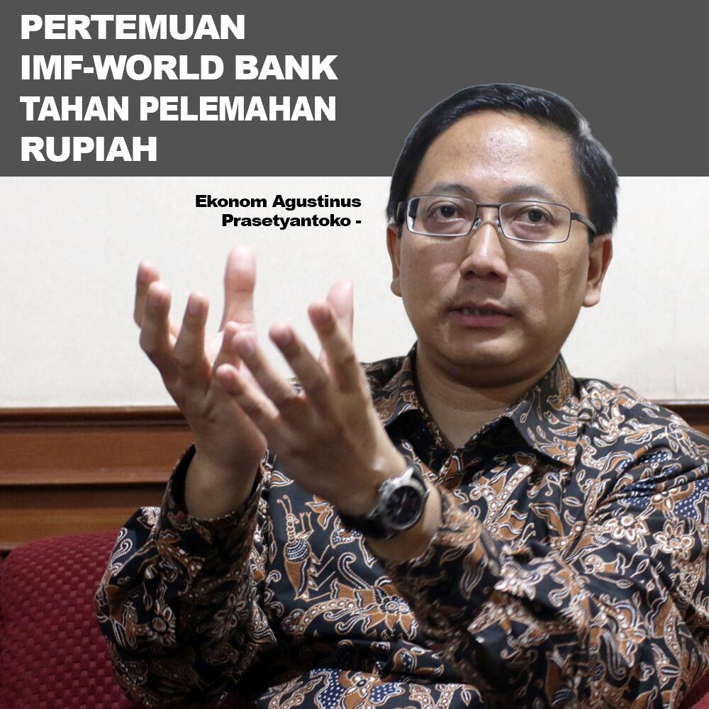 Pertemuan tahunan IMF-World Bank 2018 yang berlangsung di Bali diyakini oleh ekonom dapat menahan pelemahan nilai tukar rupiah terhadap dolar Amerika Serikat (USD) yang terus merosot. Ekonom Agustinus Prasetyantoko menjelaskan, ajang yang berlangsung sepekan ini membuat laju rupiah lebih positif.