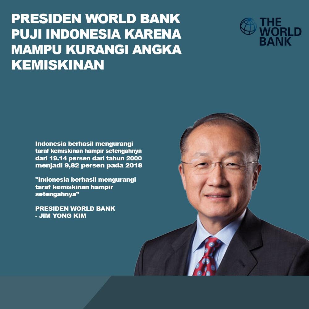 Kim juga memuji pengurangan kemiskinan yang terjadi di Indonesia. Menurut Bank Dunia, Indonesia berhasil mengurangi taraf kemiskinan hampir setengahnya dari 19.14 persen dari tahun 2000 menjadi 9,82 persen pada 2018.