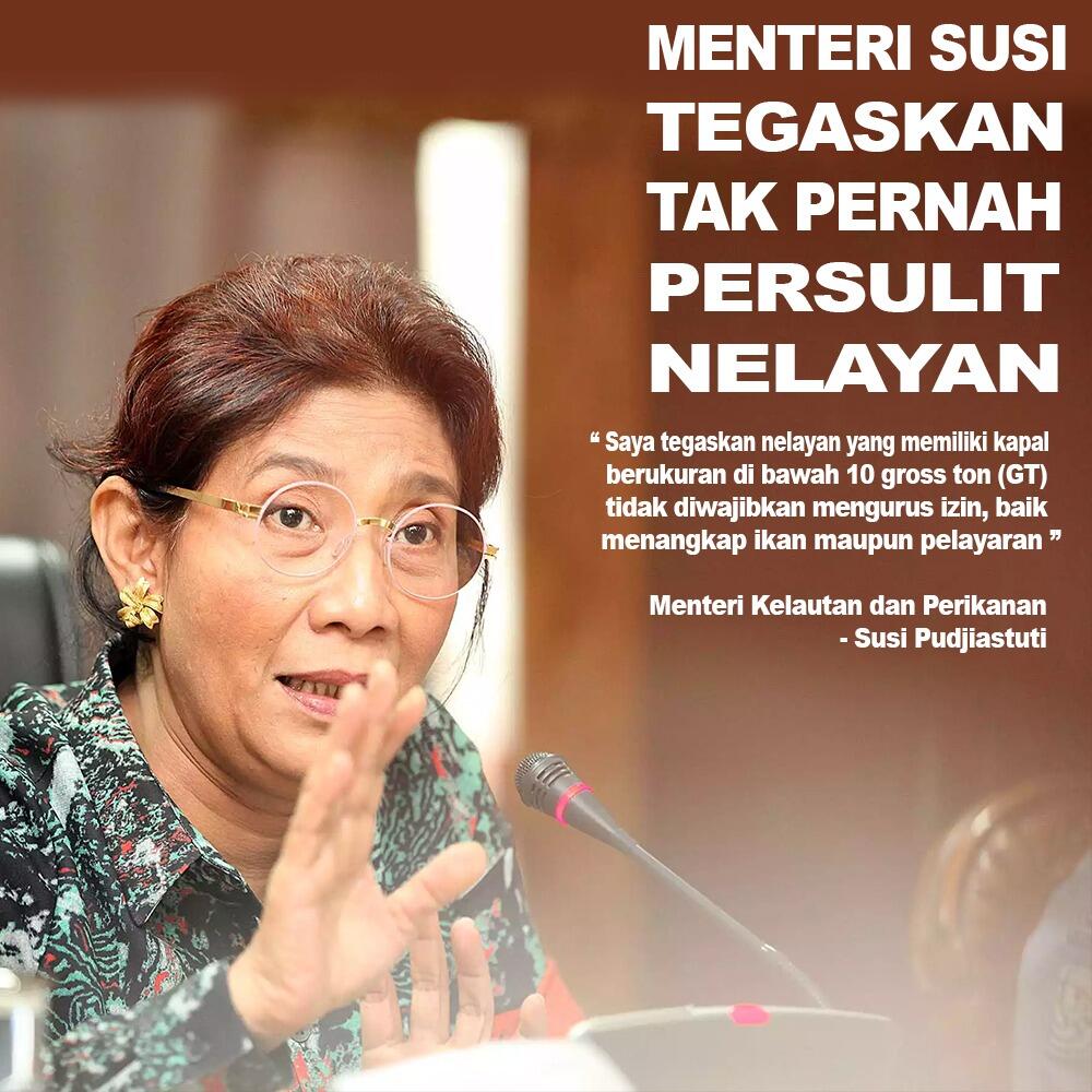 Susi menegaskan bahwa Kementrian Kelautan dan Perikanan (KKP) sudah membebaskan perizinan untuk nelayan yang memiliki kapal dibawah ukuran 10 gross tonnage (GT).