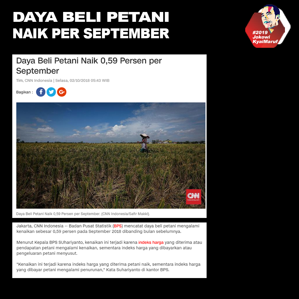 Badan Pusat Statistik (BPS) melaporkan Nilai Tukar Petani (NTP) per September 2018 mencapai 103,17 atau naik 0,59% dibandingkan periode sama bulan sebelumnya.