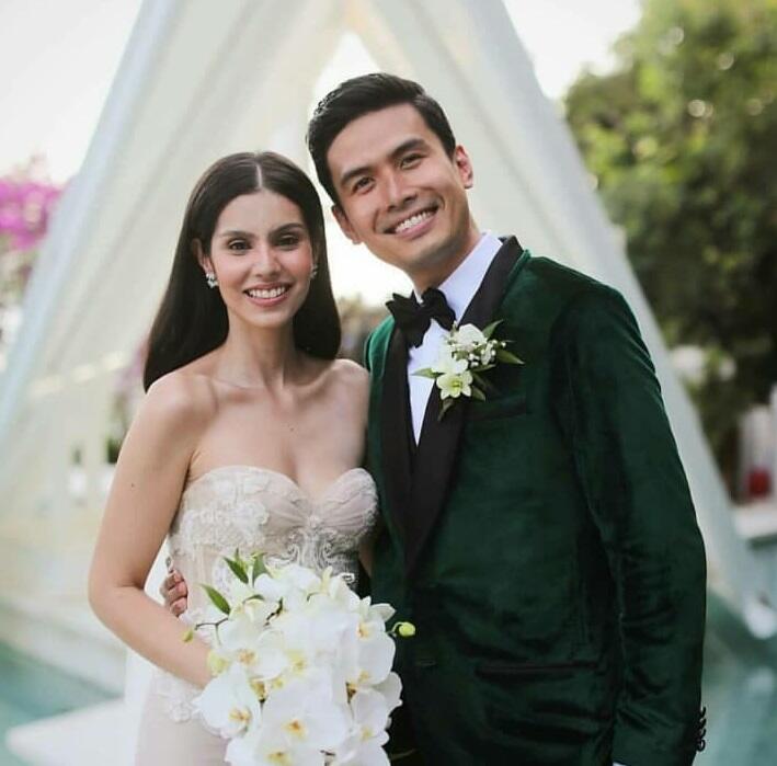Kat tampak cantik dengan balutan gaun tanpa renda karya desainer Israel Inbal Dror sedangkan Christian Bautista tampak keren dengan balutan tuxedo dengan warna hijau zamrud karya Francis Libiran.