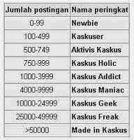 Rupanya bukan hanya di TNI, Kepolisian dan PNS saja yang mempunyai Pangkat di Republik ini, rupanya di Dunia Maya juga diantaranya di Forum terbesar di Indonesia yaitu Kaskus para membernya atau lebih enaknya lagi di sebut Kaskusermempunyai pangkat yang dinilai atau di anugerahkan oleh Kaskus berdasarkan jumlah postingan/komentarnya, tidak percaya? berikut saya jelaskan Pangkat di Kaskus berikut Prediksi Reputasi (Cendol) yang melekat di akunnya, yang sesepuh Kaskus di Skip saja :D. Lets go juragan:Posting for Newbie: